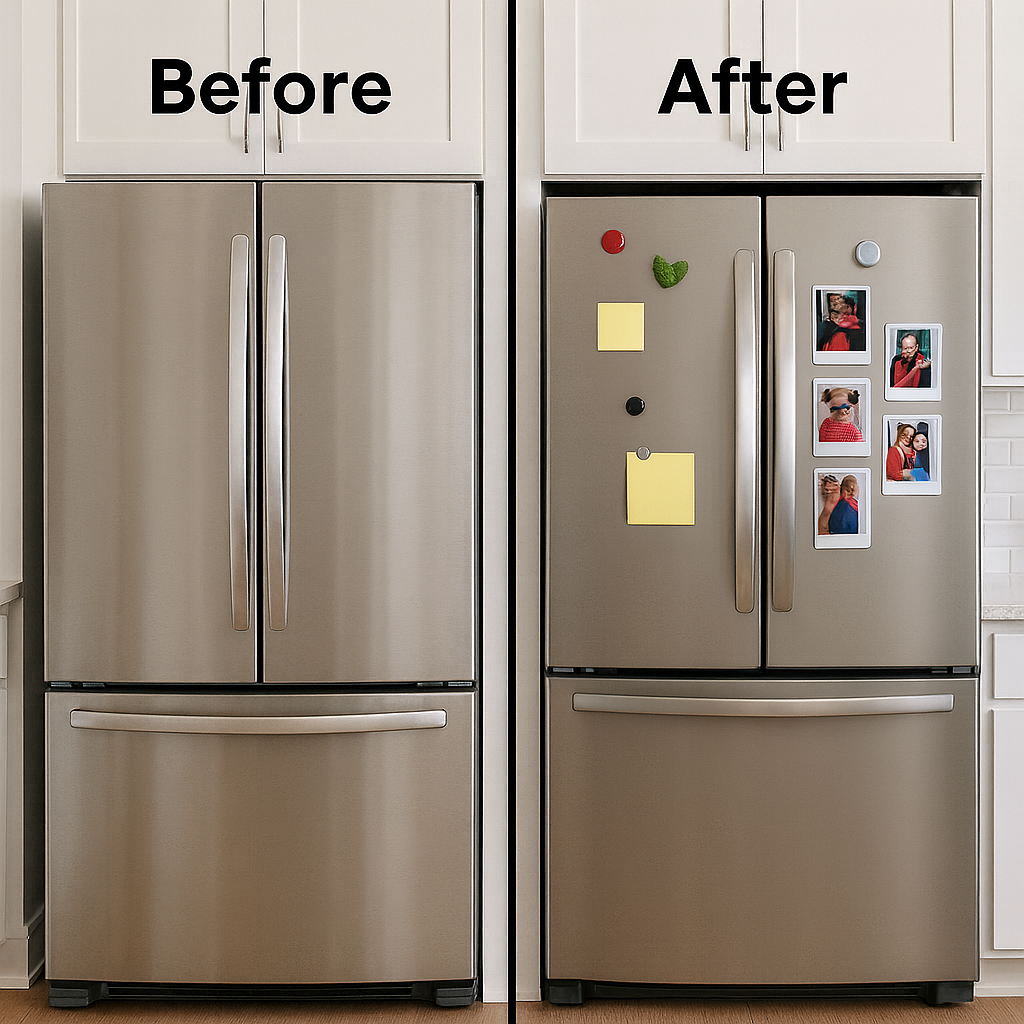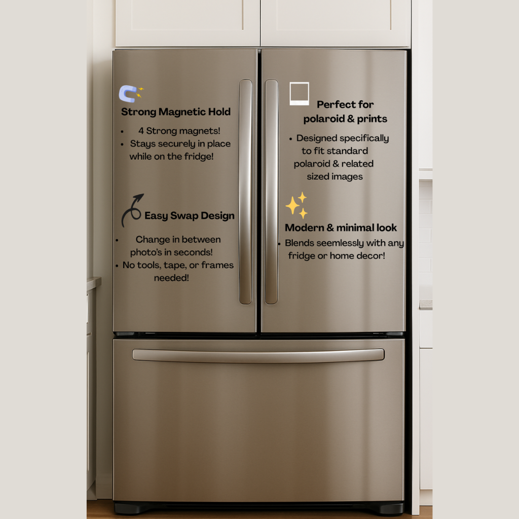 Using your SnapFrame is simple and hassle-free. Just separate the two acrylic panels, place your favorite Polaroid or printed photo in between, and let the precision-cut magnetic edges snap back together. The built-in magnets make it easy to attach your frame securely to any magnetic surface, like your fridge or office board. When you’re ready for a new look, simply pull apart the panels and swap your photo in seconds—no tools, no tape, no damage, just effortless photo updates.